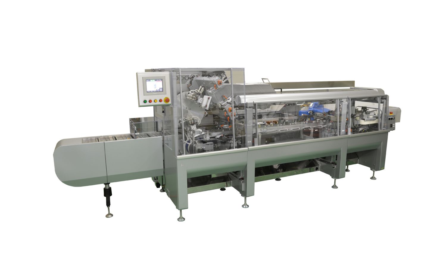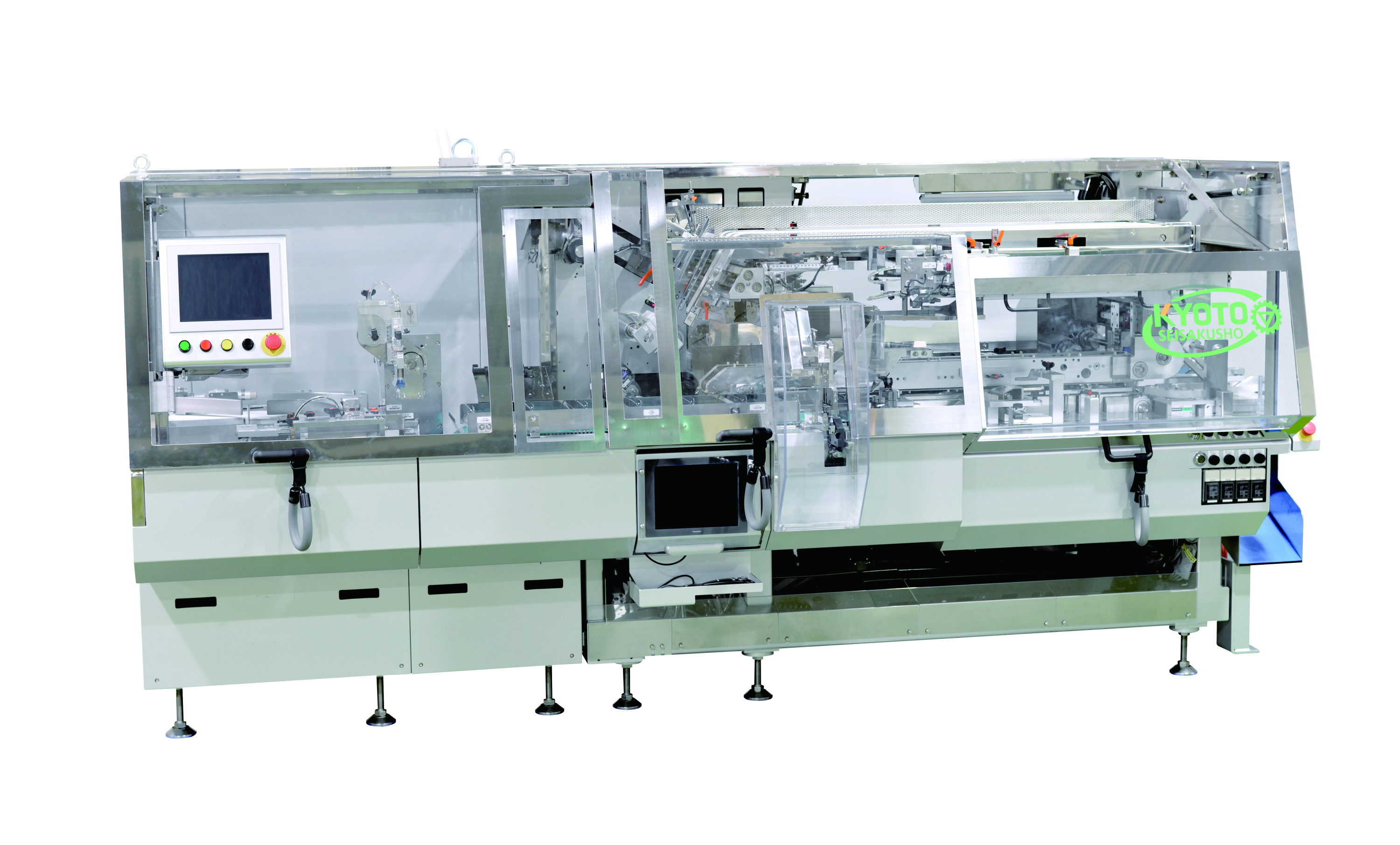Flexible Cartoning Machines can be used for packing vials, amples, rondolations, PTP, syringes and more. The machine forms autobottom/wraparound cartons and loads workpieces using the transfer unit with Kyoto’s unique control system.